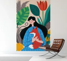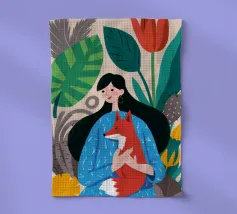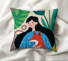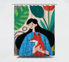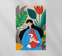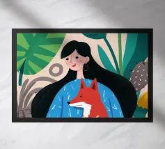 Una donna abbraccia dolcemente una volpe rossa, con il volto nascosto nella sua pelliccia, creando una scena tenera e magica di connessione tra un essere umano e un animale selvatico.