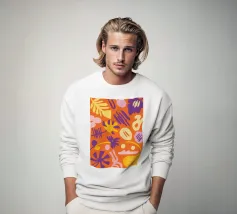 Un motivo astratto frenetico e giocoso, caratterizzato da una varietà di forme colorate, schizzi e linee in una vibrante tavolozza di viola, arancione e nero, che trasmette pura energia creativa.