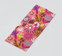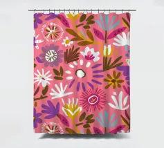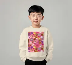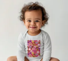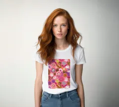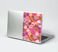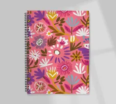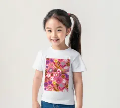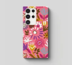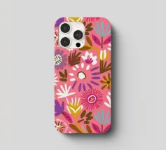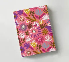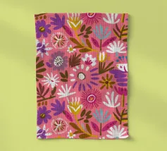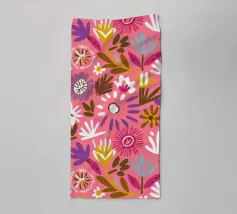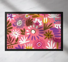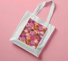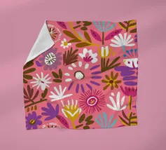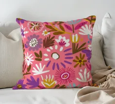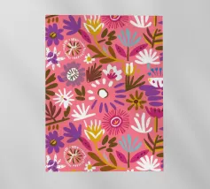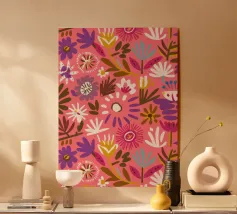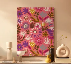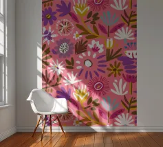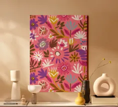 Un disegno vibrante e denso di fiori e foglie stilizzati in una tavolozza abbagliante di rosa, viola, arancione e blu, che crea un arazzo floreale gioioso ed energico.