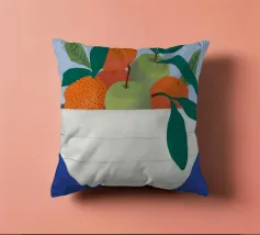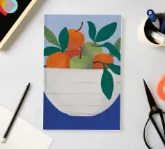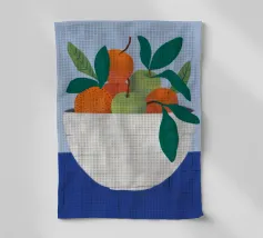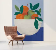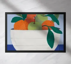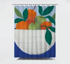 Una ciotola bianca piena di guaiave mature, alcune intere e una tagliata per mostrarne l'interno rosa, è presentata su una superficie blu. La composizione è semplice e fresca, incentrata sul fascino del frutto tropicale.
