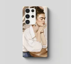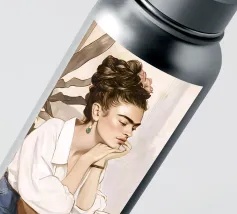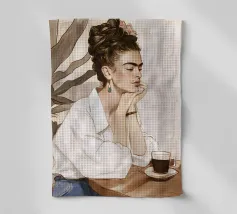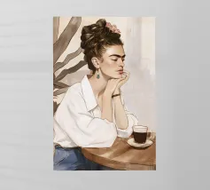 Disegno Boho dipinto da Frida Kahlo, seduta in relax con una tazza di caffè in un caffè circondato da fogliame floreale e toni terrosi che creano un'atmosfera calda e invitante.