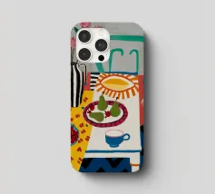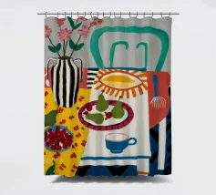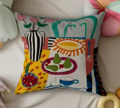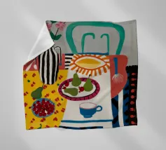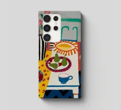 Un vaso a righe, della frutta matura e del tè su un tavolo allegro e mal assortito trasmettono calore e disinvoltura.