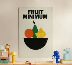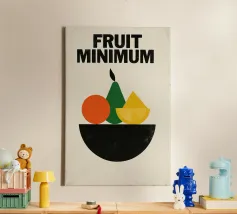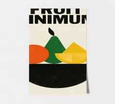 Tre frutti, tre colori, mezza tazza nera. "Fruit Minimum" è la natura ridotta ai suoi volumi più semplici, come un alfabeto della freschezza. Una pera, un'arancia, un limone? Forse. O semplicemente l'idea di frutta, pura, stilizzata, silenziosa. Un poster dall'eleganza modernista, perfetto per adornare una parete senza strafare, ma dicendo molto. Per gli amanti del dettaglio giusto, del design sobrio e dei colori decisi.