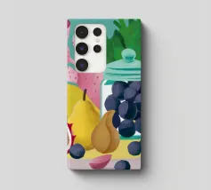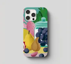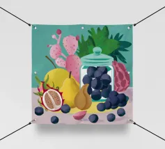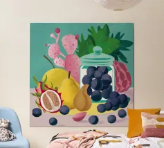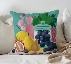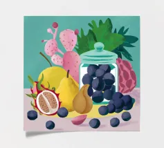 Una rigogliosa composizione di still life di vari frutti come pere, uva e frutti della passione, con cactus e un vaso di vetro, su un ricco sfondo verde acqua.