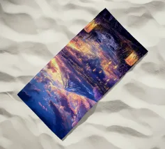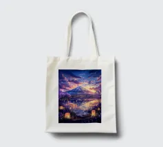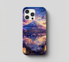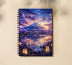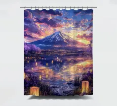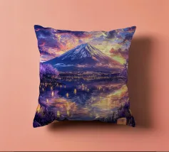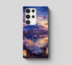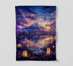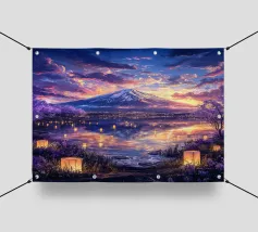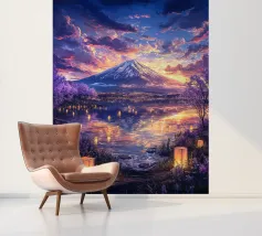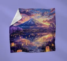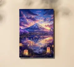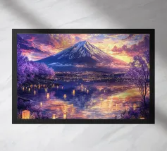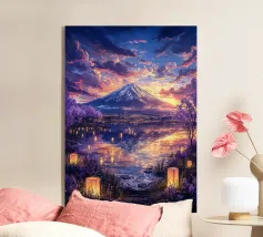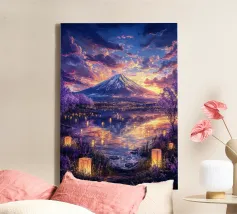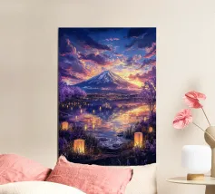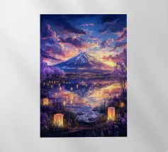 Nel cuore del crepuscolo, il Fuji si riflette nelle acque illuminate dalle lanterne. I fiori incoronano la valle di fuoco rosa, un paesaggio di pace dove la natura diventa luminosa.