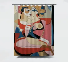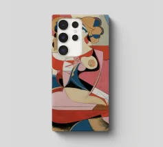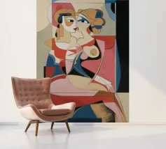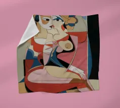 Questo dipinto raffigura figure astratte in una posa sensuale, con un mix di colori rossi, beige e neri. La composizione è audace ed espressiva.