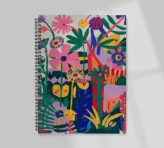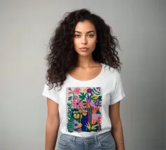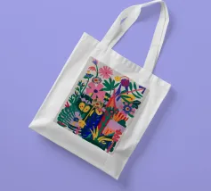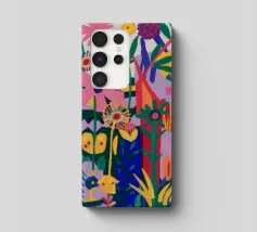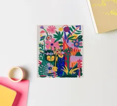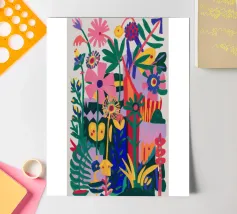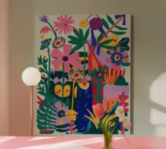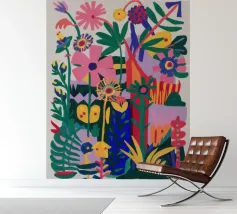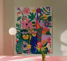 Una fusione vibrante e caotica di volti astratti, fiori in fiore e foglie rigogliose, che crea un arazzo massimalista di vita e colore.