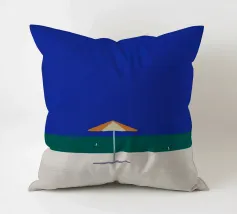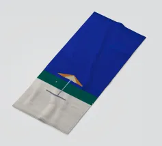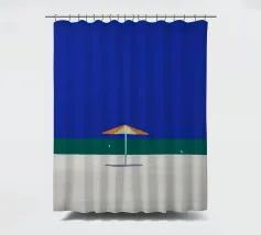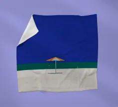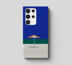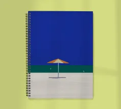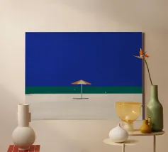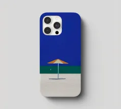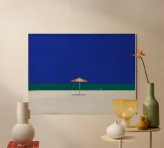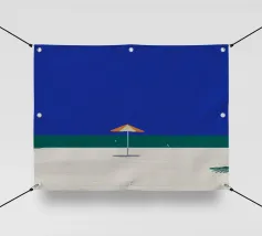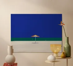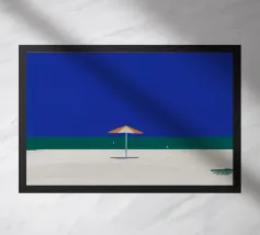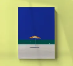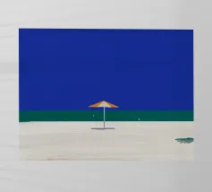 Una scena di spiaggia minimalista è raffigurata con un ombrellone centrale arancione e bianco su una striscia di sabbia, con alle spalle un mare calmo e turchese e un cielo limpido e azzurro. In lontananza, due piccoli uccelli o gabbiani sono visibili vicino alla linea di galleggiamento, mentre un accenno di fogliame verde nell'angolo in basso a destra suggerisce la presenza di una pianta o di un cespuglio.
