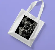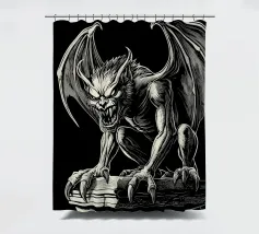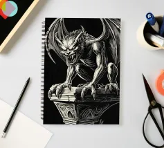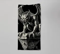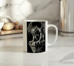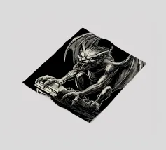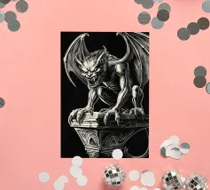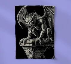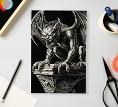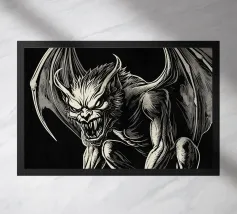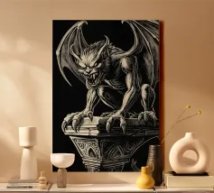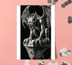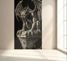 Un terrificante gargoyle dall'espressione demoniaca siede su un piedistallo a colonna riccamente decorato con le ali spalancate. I suoi artigli affilati si conficcano nella pietra, mentre la bocca spalancata mostra minacciosamente i denti. Le linee dettagliate conferiscono alla figura profondità e un effetto drammatico che ricorda la mezzatinta classica. Lo sfondo scuro mette ancora più in risalto la sinistra creatura ed enfatizza la sua minacciosa presenza. Un motivo di grande effetto per gli amanti dei mondi fantasy oscuri.