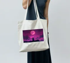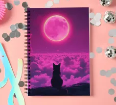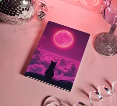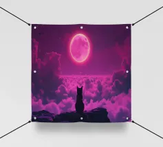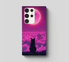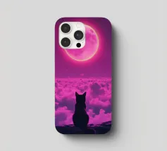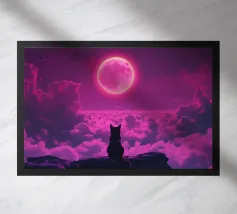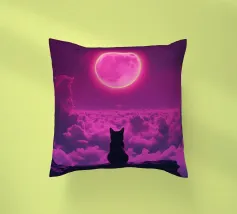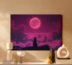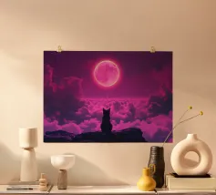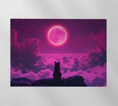 luna nuvole gatto cielo notturno silhouette cielo rosa fantasia onirico rocce felino che guarda paesaggio etereo aura magica mistico scena notturna tinte vivaci luce incandescente evento celeste ambiente tranquillo vista maestosa figura isolata