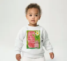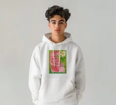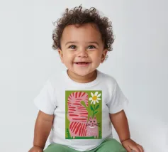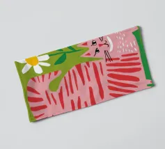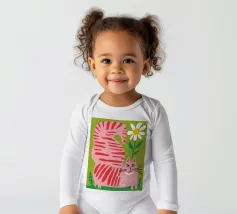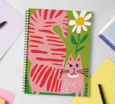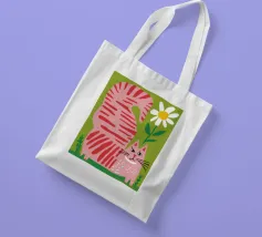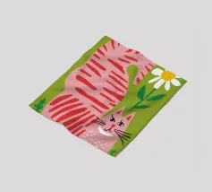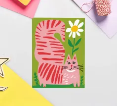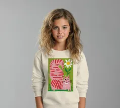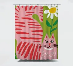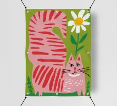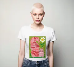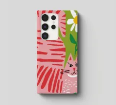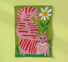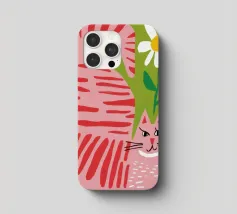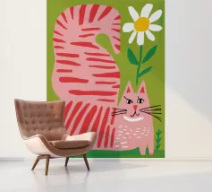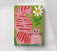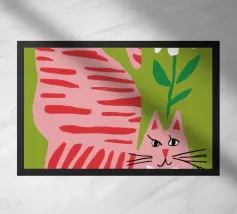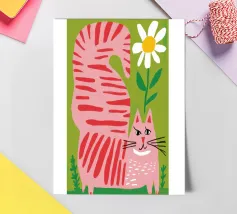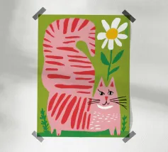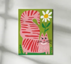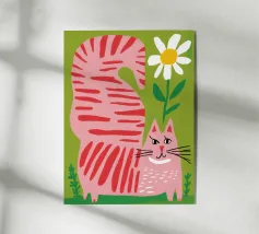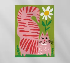 Un'illustrazione stravagante di un gatto a strisce rosa con un'espressione felice, su uno sfondo di grandi foglie verdi e una margherita bianca.