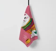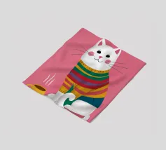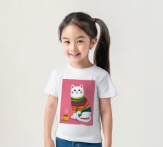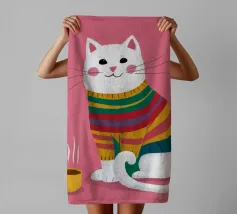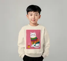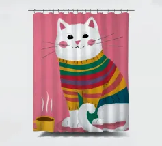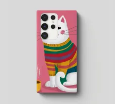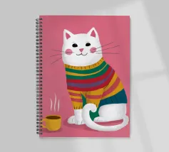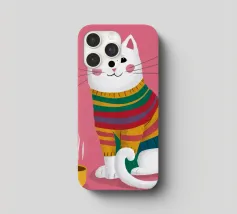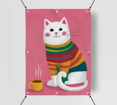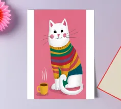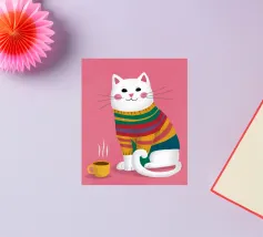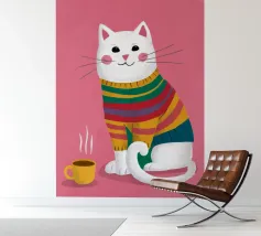 Un affascinante gatto bianco con gli occhi azzurri indossa un maglione a righe colorate in un arcobaleno di colori: rosso, arancione, giallo, verde e blu. È seduto accanto a una tazza da tè gialla, su uno sfondo rosa.