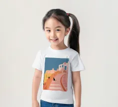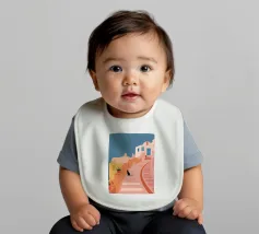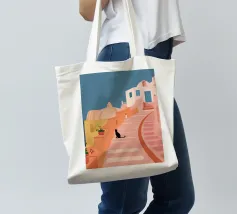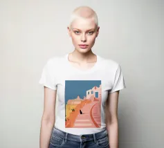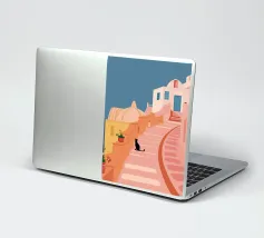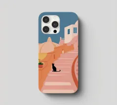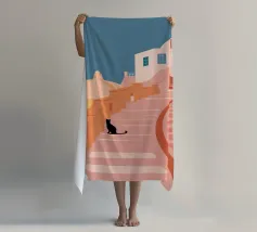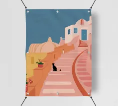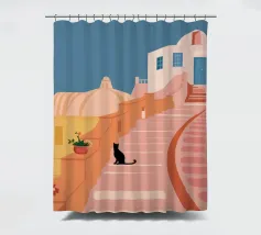 Un'incantevole illustrazione di un gatto nero seduto sui gradini di una bella città di mare, con edifici resi in rosa tenue. La scena è tranquilla, pittoresca e piena di fascino mediterraneo.
