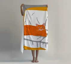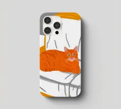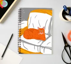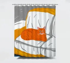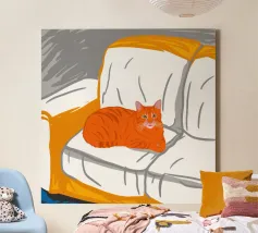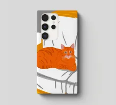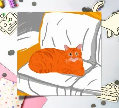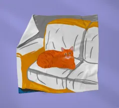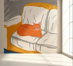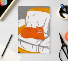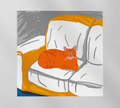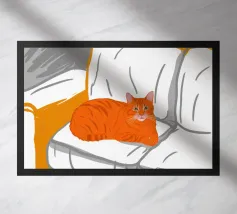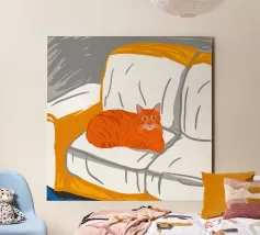 Un'illustrazione accogliente e commovente di un gatto rosso raggomitolato che dorme pacificamente su un comodo divano bianco. Questa opera d'arte cattura perfettamente la gioia semplice e serena di un animale domestico che sonnecchia.