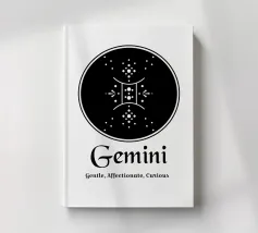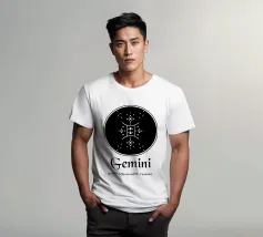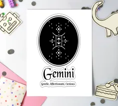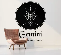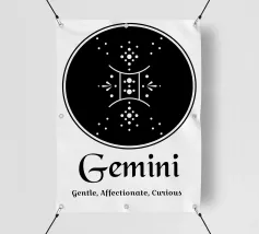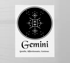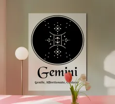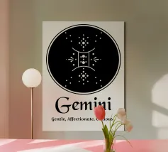 Questo disegno rappresenta il segno zodiacale dei Gemelli, simboleggiato da due gemelli in equilibrio e armonia. Con una composizione circolare, l'immagine gioca su elementi geometrici e punti stilizzati che evocano la dualità e la versatilità di questo segno. Le linee e i dettagli centrali sono equilibrati, suggerendo il legame tra le due personalità gemelle, mentre la disposizione dei punti intorno al cerchio enfatizza l'idea del movimento e del continuo cambiamento, tratti tipici dei Gemelli. Il design minimalista con contrasto bianco e nero lo rende elegante e facilmente adattabile a diversi stili di arredamento.