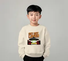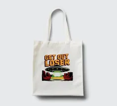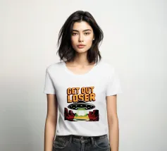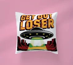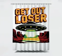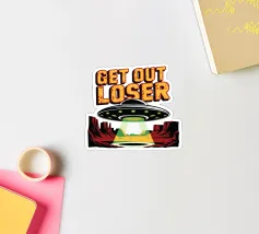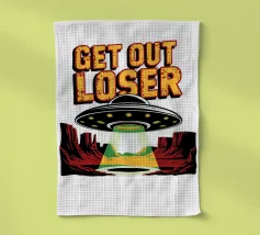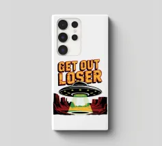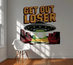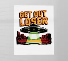 Un UFO emette un fascio di luce intensa su un paesaggio desertico, con sopra un testo in grassetto che recita "Vattene, perdente".