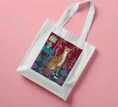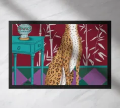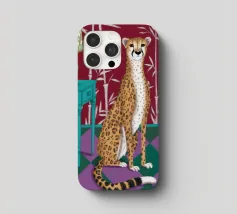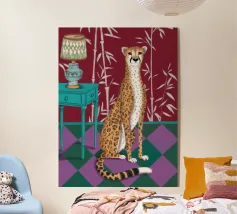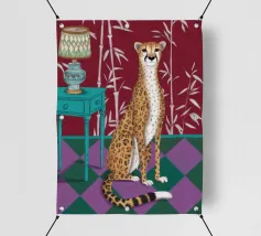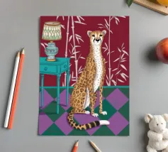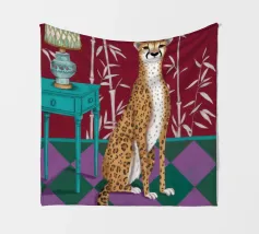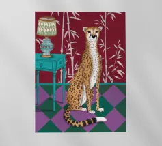 Illustrazione di un ghepardo che si adagia maestosamente su un tappeto colorato e a fantasia in una stanza elegante. La composizione è una miscela chic, eclettica e leggermente surreale di bellezza selvaggia e comfort domestico.