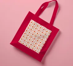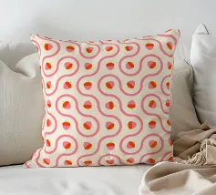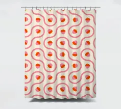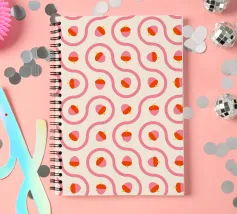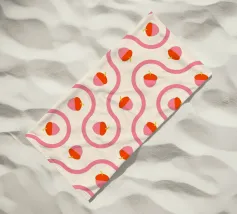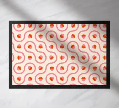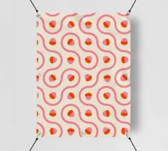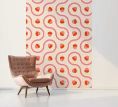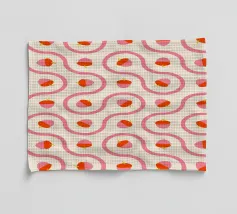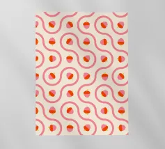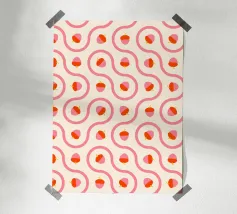 Ghiande grafiche rosa e rosse accoppiate a linee ondulate di piastrelle truchet su uno sfondo crema chiaro.