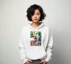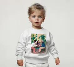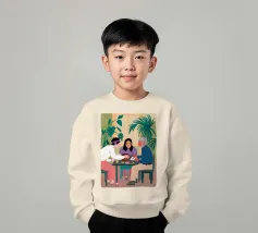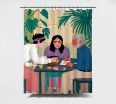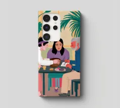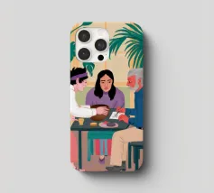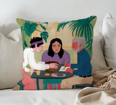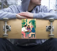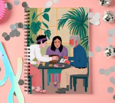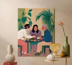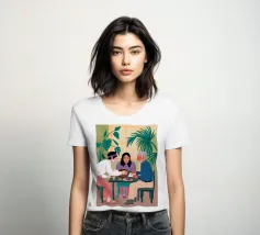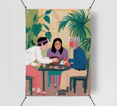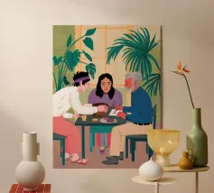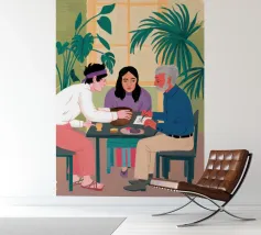Illustrazione di un gruppo di amici diversi seduti attorno a un tavolo, che giocano a carte e si divertono in compagnia. La scena è una rappresentazione calda, gioiosa e commovente dell'amicizia e del legame sociale.
