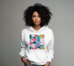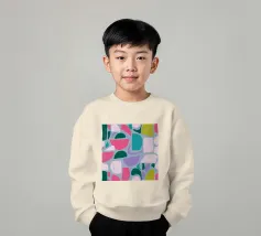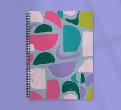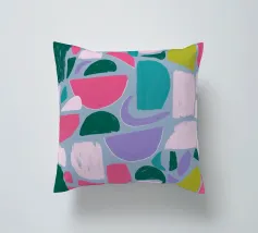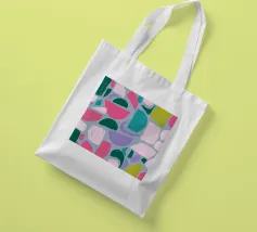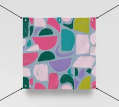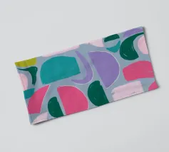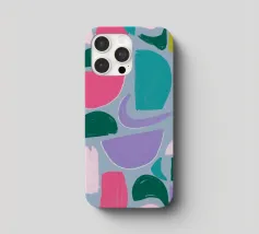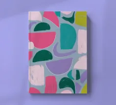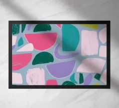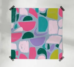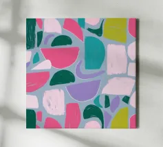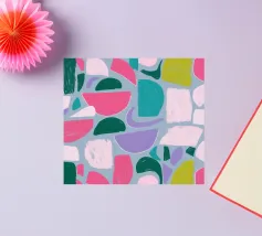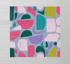 Un giocoso disegno astratto di forme amorfe dai bordi morbidi in una palette di colori tenui come il verde, il blu, il rosa e il rosso. La composizione è come un puzzle colorato e delicato, senza spigoli vivi.