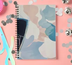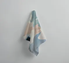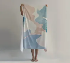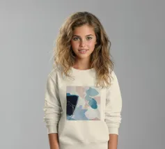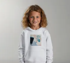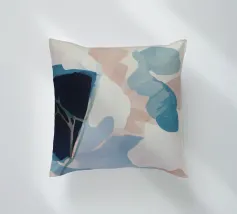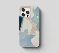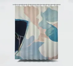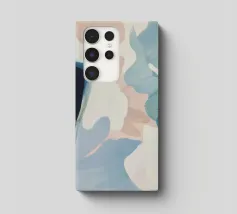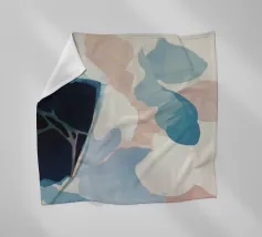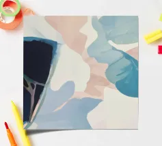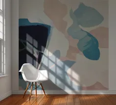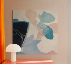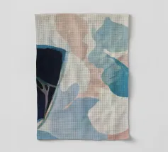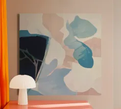 Un'opera astratta con grandi forme simili a foglie in blu e verde tenui, sovrapposte a forme più chiare in beige e crema, che creano un sottile gioco di ombre e un senso di profondità organica. Stile Melissa Herrington.