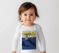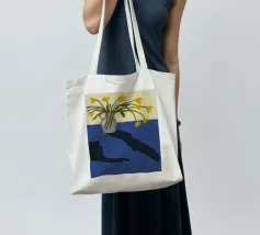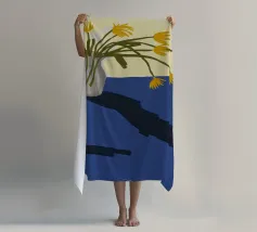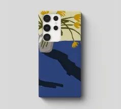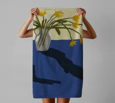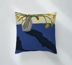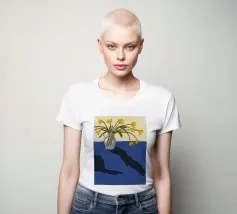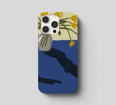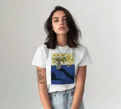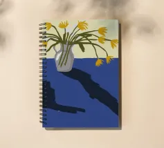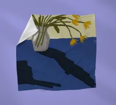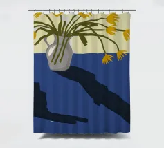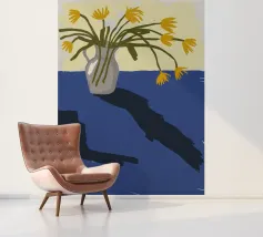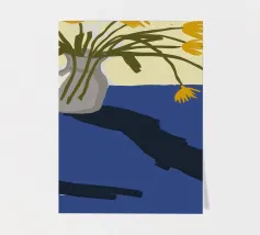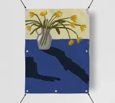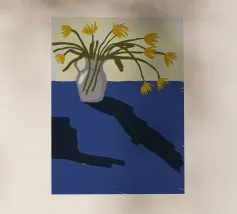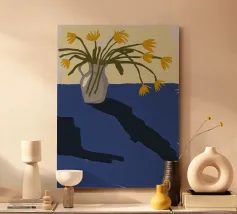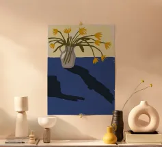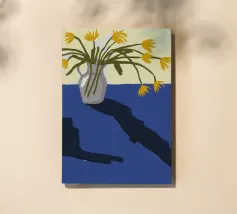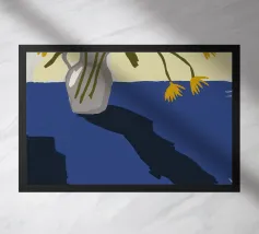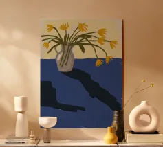 Un'elegante illustrazione di natura morta incentrata su un vaso di vetro trasparente che contiene fiori bianchi e gialli. La composizione è definita da una lunga e drammatica ombra blu proiettata dal vaso, che suggerisce una forte fonte di luce e aggiunge un senso di tempo e di tranquilla drammaticità alla scena.
