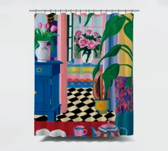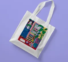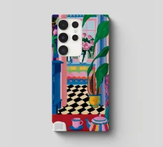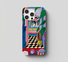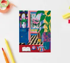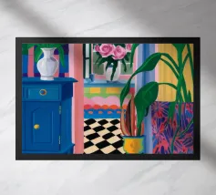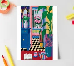 Una scena d'interni dai colori vivaci con un mobile blu, un vaso di grandi foglie verdi, un tappeto a motivi e un libro aperto, che creano uno spazio domestico gioioso e artistico.
