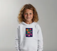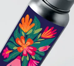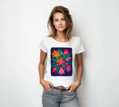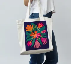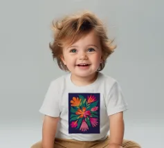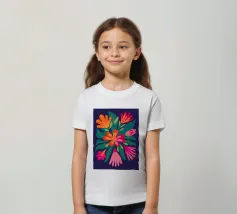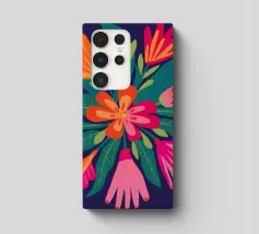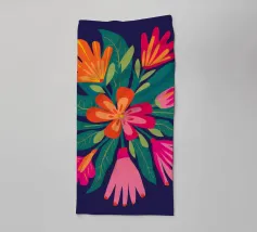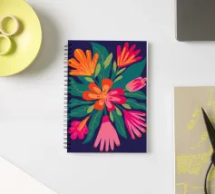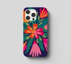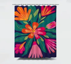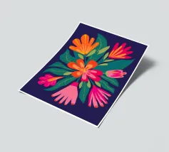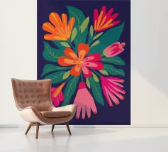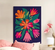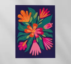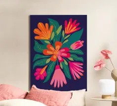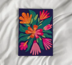 Un vibrante bouquet di fiori stilizzati e raccolti a mano di colore arancione, rosa e verde acqua su uno sfondo blu scuro, che irradia gioia pura.