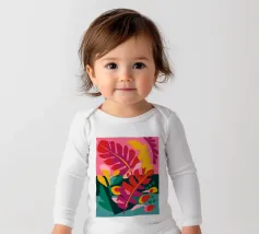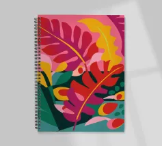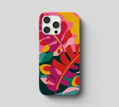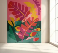 Una scena di giungla lussureggiante e vibrante è dominata dai toni del rosso e del rosa, con foglie e fogliame tropicale che creano un mondo botanico denso, caldo e dai colori passionali.