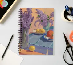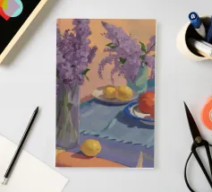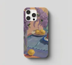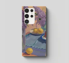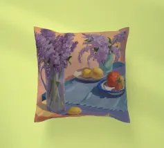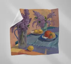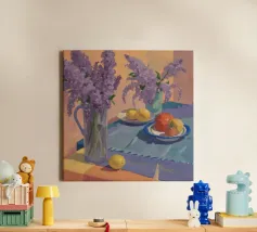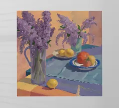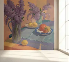 Un'elegante natura morta che mostra fronde a cascata di alti glicini viola o fiori simili disposti con grazia in una brocca di vetro trasparente, accompagnati da arance vivaci e altra frutta su un tavolo drappeggiato con un bel panno blu a fantasia.