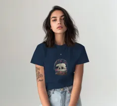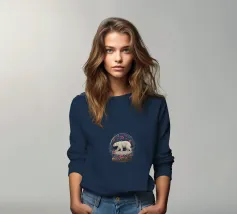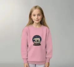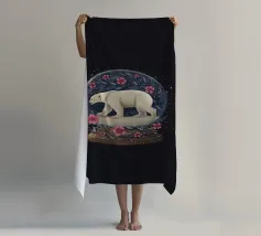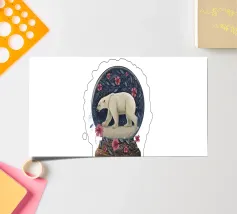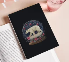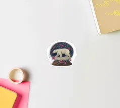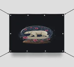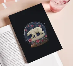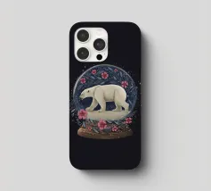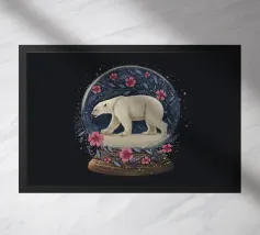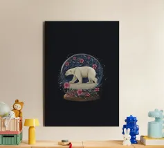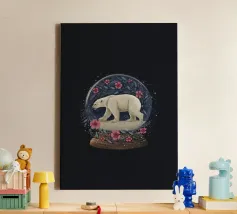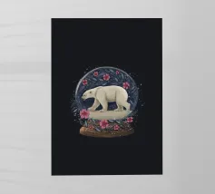 Un orso polare bianco che viaggia in una vorticosa sfera di neve floreale circondata da fiori rosa, stelle scintillanti e rami botanici blu. Ispirato alla vita degli orsi polari canadesi vicino alla tundra aperta e all'aria artica della Baia di Hudson.