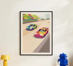 Illustrazione di un go-kart colorato su una pista con uno stile geometrico moderno.
