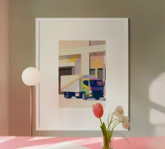 Illustrazione di un go-kart minimalista su una pista con uno stile geometrico moderno.