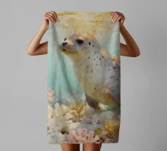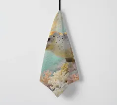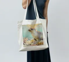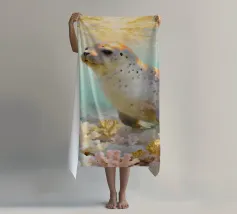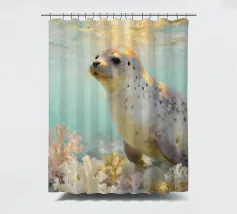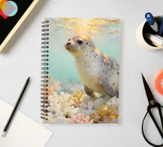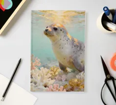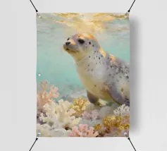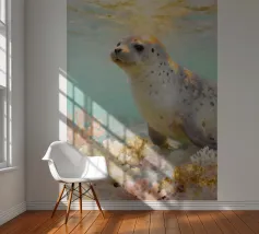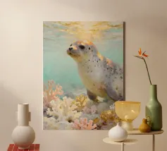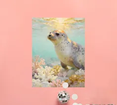 Immersa in una delicata luce turchese, una foca maculata riposa tra i coralli pastello mentre i raggi dorati attraversano l'acqua calma. Questa opera d'arte cattura il cuore sereno dell'oceano: pacifico, tenero e pieno di bellezze estetiche sotto le onde. Immaginata da Trinkets NL Design Studio, visualizzata con l'aiuto dell'intelligenza artificiale.