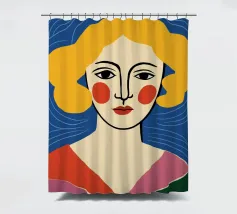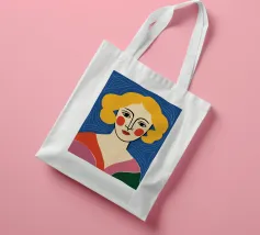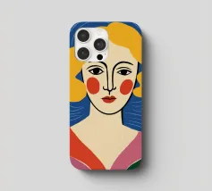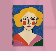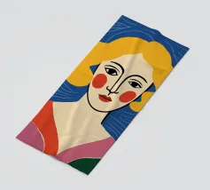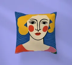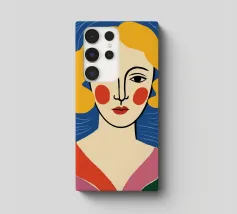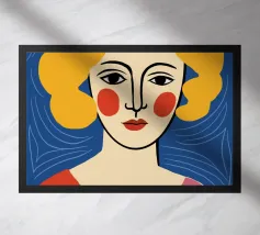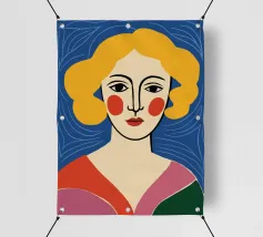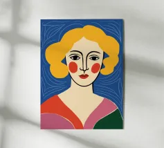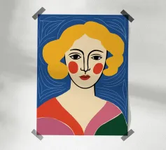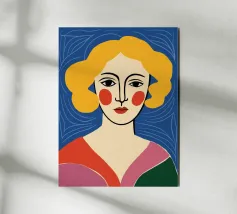 Un ritratto stilizzato raffigura una donna con guance rosse, lineamenti del viso neri e capelli gialli su uno sfondo blu. L'abbigliamento comprende vibranti tonalità di rosso, rosa e verde, che contribuiscono alla vivacità della composizione.