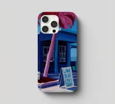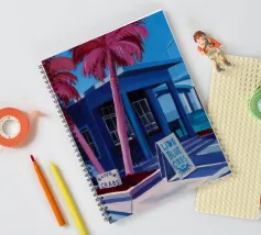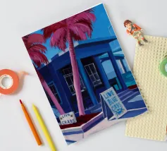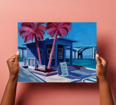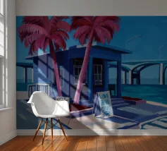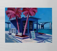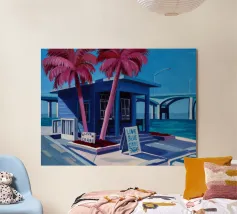 Un dipinto di un edificio modernista con un caratteristico tetto angolato, probabilmente in un luogo come Palm Springs, caratterizzato da linee pulite, palme e una fresca luce blu.