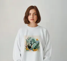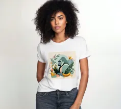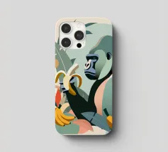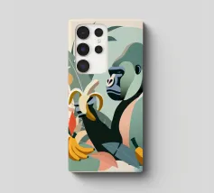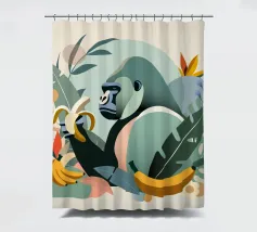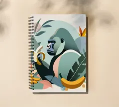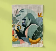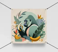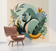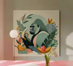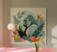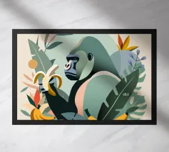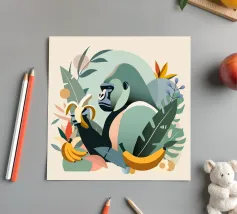 Un imponente gorilla tiene in mano una banana nel mezzo di un lussureggiante paesaggio tropicale. Questo disegno realizzato ad arte combina piante esotiche, colori vivaci e la maestosa presenza di un gorilla. Perfetta per progetti che celebrano la bellezza della natura e della fauna selvatica, questa illustrazione trasmette un forte ma armonioso senso di natura selvaggia e tranquillità.Gorilla maestoso: rappresentazione di un gorilla orgoglioso che tiene in mano una banana. Dettagli tropicali: circondato da piante e frutti esotici.