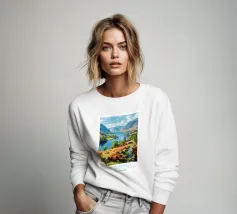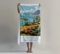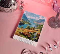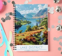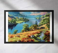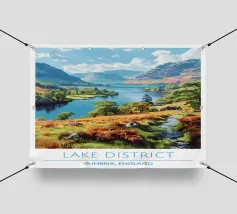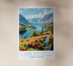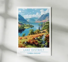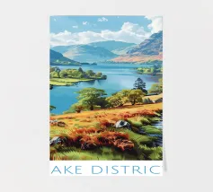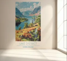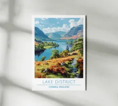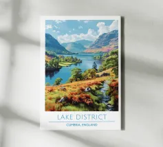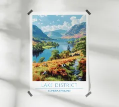 Scoprite la bellezza iconica del Lake District, in Cumbria, Inghilterra, con questa magnifica stampa d'arte digitale. L'immagine cattura un'ampia veduta della valle, con un sereno lago blu circondato da dolci colline e vibranti colori autunnali. Un piccolo ruscello conduce lo sguardo verso una fattoria lontana, evocando l'atmosfera tranquilla della regione. Realizzata in un audace stile da poster di viaggio vintage, l'opera d'arte enfatizza la grandezza naturale e la ricca tavolozza della campagna inglese. Questo download digitale di alta qualità viene fornito con un'eccezionale risoluzione di 7000x5000 pixel a 300 dpi, che garantisce una nitidezza superba e un'ottima qualità di stampa.