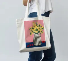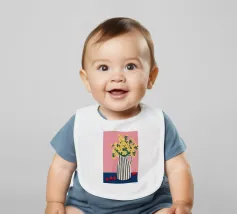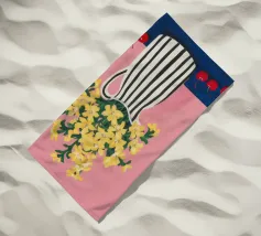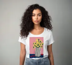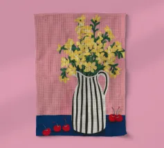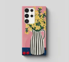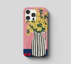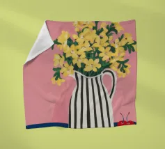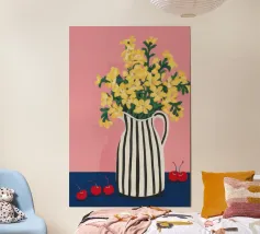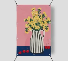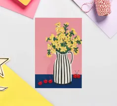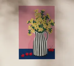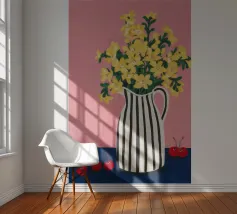 Una natura morta moderna e grafica di un bouquet di fiori gialli brillanti in un vaso a righe bianche e nere di grande effetto. Lo sfondo rosa tenue crea un delicato contrasto con i motivi e i colori audaci.