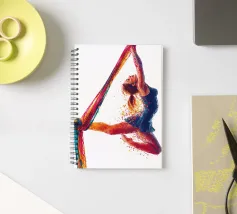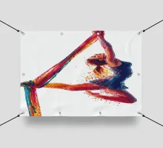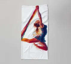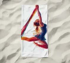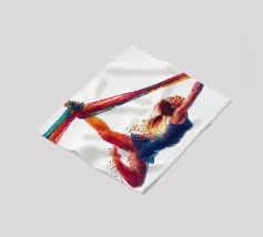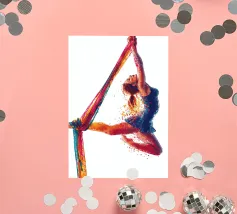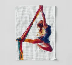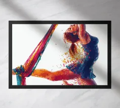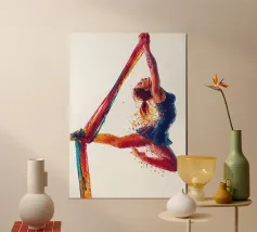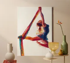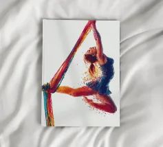 Questa colorata raffigurazione mostra una donna in una posa elegante durante un'esibizione di acrobazia aerea con sciarpe. La donna si aggrappa alle sciarpe dai colori vivaci con entrambe le braccia, mentre il suo corpo adotta una postura espressiva e dinamica. La sua posa trasmette leggerezza, forza e grazia allo stesso tempo. Le esplosioni di colore intorno alla figura rafforzano la sensazione di movimento e di espressione artistica. Lo sfondo è mantenuto in bianco puro, ponendo il soggetto in primo piano e concentrandosi interamente sull'acrobata.