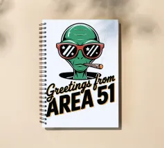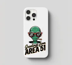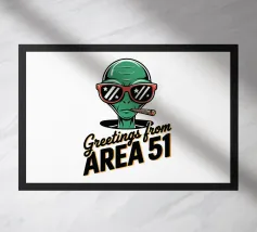 Un personaggio alieno verde che indossa occhiali da sole rossi e fuma un sigaro è raffigurato sopra la scritta "Greetings from Area 51". Il disegno mescola umorismo e temi extraterrestri.