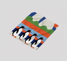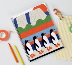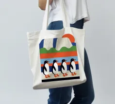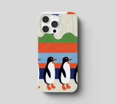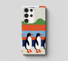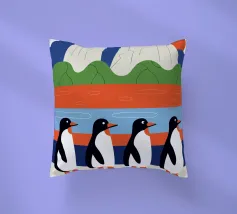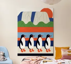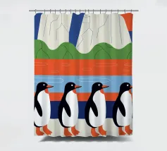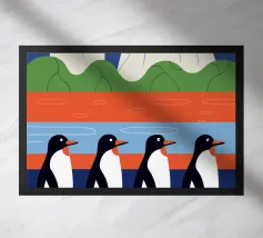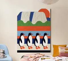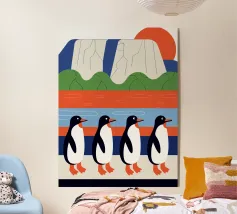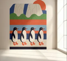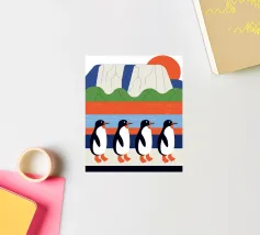 Godetevi una vivace illustrazione antartica con un gruppo di pinguini che camminano in fila con montagne e sole sullo sfondo.