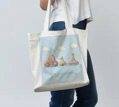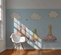 Un adorabile topo guida un allegro convoglio di animali sotto soffici nuvole e farfalle svolazzanti. Grazie ai toni tenui dell'acquerello e ai dolci personaggi come la giraffa, il coccodrillo e il topo, questa incantevole illustrazione dona calore, allegria e un senso di avventura alla stanza o alla cameretta di ogni bambino.