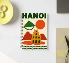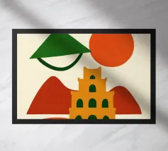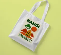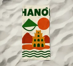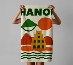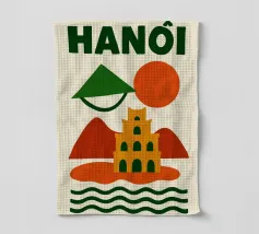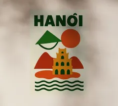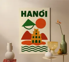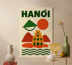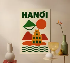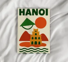Illustrazione astratta di Hanoi che combina un cappello conico vietnamita, una pagoda e montagne sotto un sole nascente e un cielo arancione. Le silhouette pure e i colori caldi creano un'atmosfera poetica e serena, evocando la ricca cultura e lo stile di vita gentile del Vietnam. Un invito al viaggio e alla contemplazione per gli amanti dell'arte grafica.