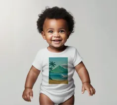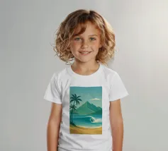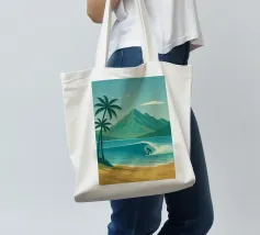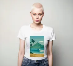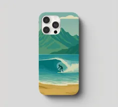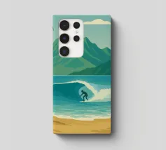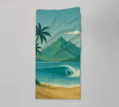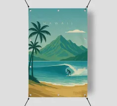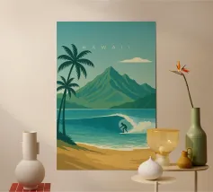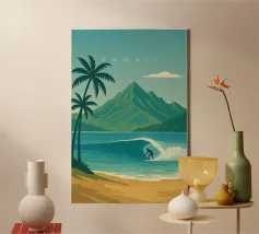 Disegno di viaggio estivo minimalista e decorativo con una bella spiaggia e un'onda che viene surfata da un surfista. Montagne verdi sulla costa e palme, tipiche delle Hawaii. Design di vacanze estive per tutti coloro che amano andare in vacanza alle Hawaii o negli Stati Uniti in generale.