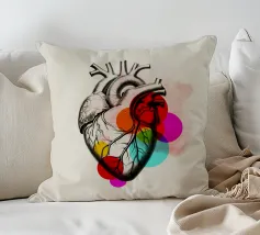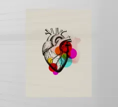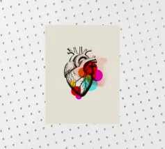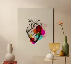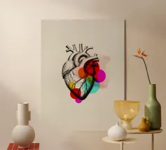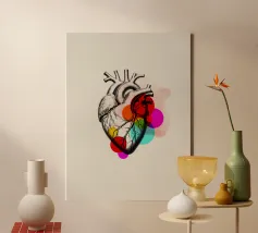 Questo poster di grande impatto presenta un cuore anatomico disegnato a mano e sovrapposto a cerchi di colori vivaci e traslucidi. Perfetto per l'arredamento moderno, per i professionisti della medicina o per chiunque apprezzi la fusione di scienza e arte astratta.