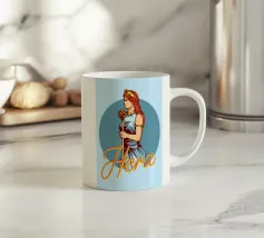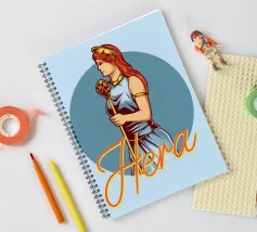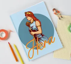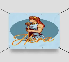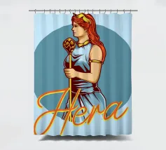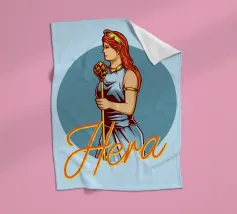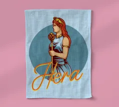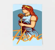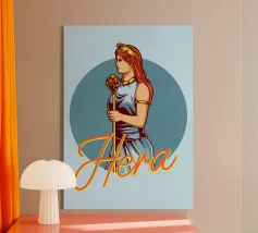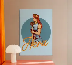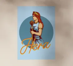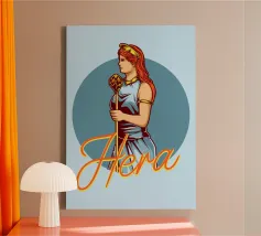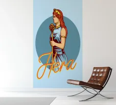 Era, la regina dell'Olimpo, è raffigurata di profilo. Il suo diadema dorato e lo scettro riccamente decorato sottolineano la sua autorità divina. La combinazione di colori rosso e oro sottolinea la sua aura maestosa.