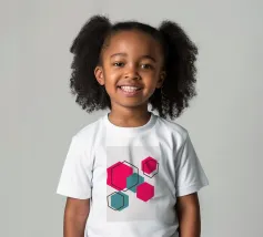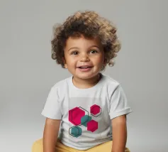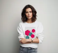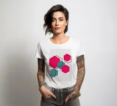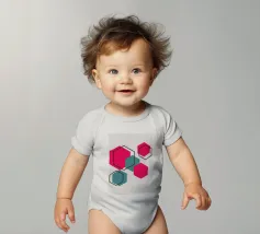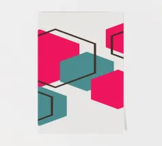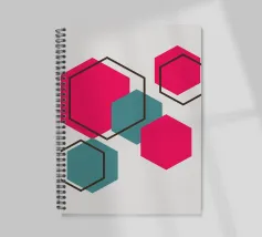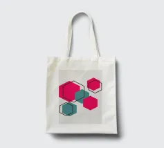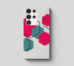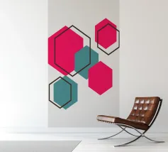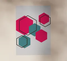 Esagoni luminosi nei toni del rosa e del verde acqua sono disposti in un motivo sparso su uno sfondo grigio chiaro. Ogni forma solida è abbinata a un contorno esagonale sovrapposto, creando un disegno geometrico e stratificato.