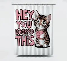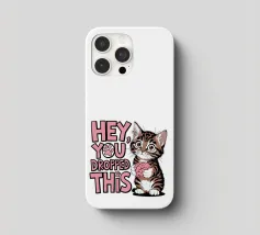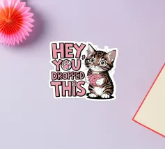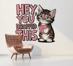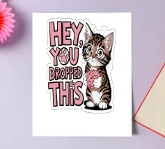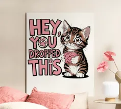 Un simpatico gattino tiene in mano un cervello con occhi spalancati, accanto al testo scherzoso "Ehi, ti è caduto questo" in lettere rosa e bianche.