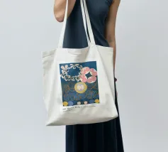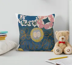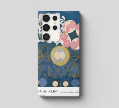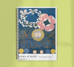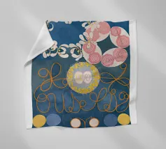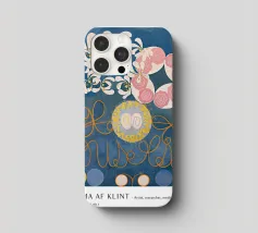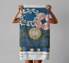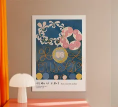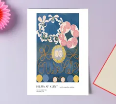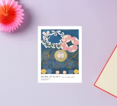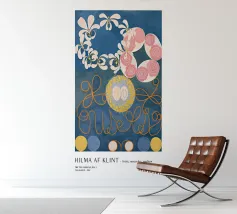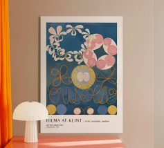 Questo accattivante poster di mostra presenta "The Ten Largest, No. 1, Childhood - 1907" di Hilma af Klint, una profonda opera astratta su un ricco sfondo blu. La composizione è un vibrante arazzo di forme organiche, tra cui delicati fiori bianchi e rosa in alto e audaci linee arancioni, vorticose e quasi calligrafiche in basso. I cerchi gialli e blu ancorano la parte inferiore, contribuendo all'estetica armoniosa e simbolica. Quest'opera mostra la visione spirituale e astratta pionieristica di Klint, che esplora i temi dell'inizio della vita. Il poster pubblicizza "Hilma af Klint - Artista, ricerca